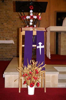 Wheat for Flanders Fields, red poppies for remembrance and white